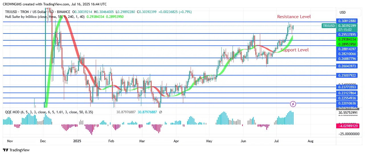 The price of TRON may be ready to surpass the $0.31 and $0.32 barriers if the buying trend persists above $0.30. The price may become closer to the $0.28 and $0.26 scripts if it remains below $0.29.