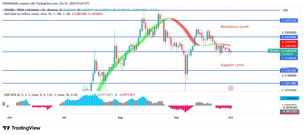 The bulls lost momentum at the resistance level of $0.36. When the price of TRON falls below the Hull Suite forex signals indicator, a profit is lost. Because it is below zero, the QQE MOD Crypto signaling indicator displays a negative trend. The price of TRON may be prepared to surpass the $0.36 and $0.37 barriers if the buying enthusiasm keeps up past $0.34. The price may grow closer to the $0.32 and $0.30 scripts if it remains below $0.33.