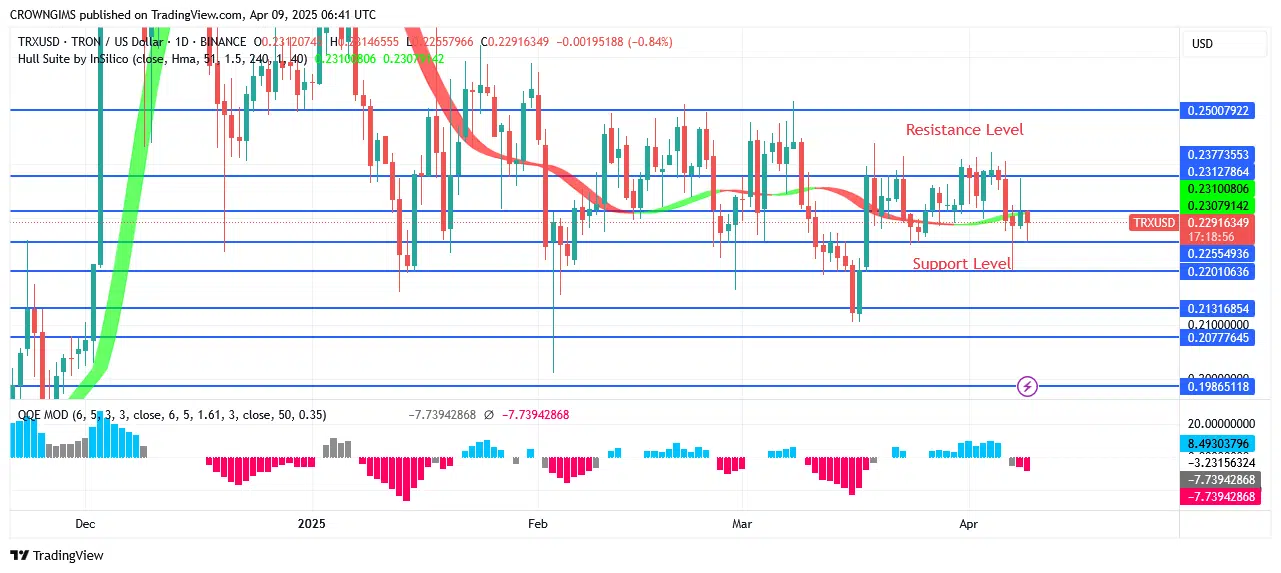 If the buying trend continues over $0.23, the price of TRON might be poised to break through the $0.25 and $0.27 barriers. If the price stays below $0.22, it can approach the $0.21 and $0.20 scripts.