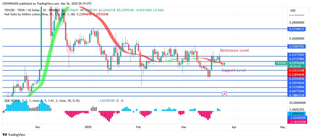 The bulls lost momentum at the $0.34 resistance level. When the price of TRON falls below the Hull Suite forex signals indicator, bulls lose money. Because it is below zero, the QQE MOD Crypto signaling indicator displays a negative trend. If the purchasing trend persists over $0.24, the price of TRON might be prepared to break above the $0.30 and $0.34 obstacles. If the price stays below $0.22, it can approach the $0.21 and $0.20 scripts.