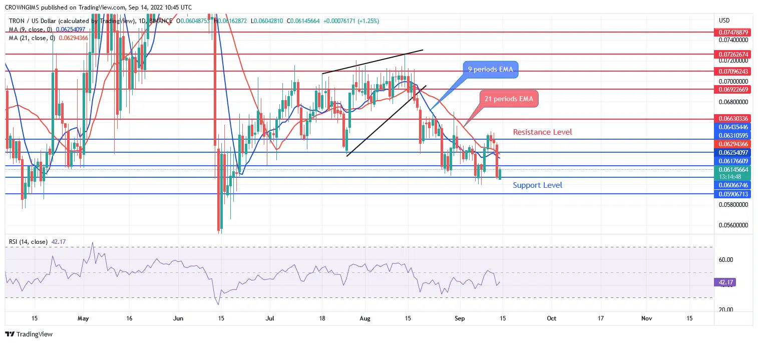 TRXUSD is bearish on the daily chart. Sellers’ momentum is increasing in the Tron market. The price is equally decreasing as usual. Bears continue to dominate the TRON market. Last week, the price was trading above the $0.064 before the sellers interrupted the buyers. When buyers of TRX/USD were unable to push the price higher far above the resistance level of $0.064, sellers pushed price towards the support level of $0.060. Strong bearish candles were produced which further reduces the price. TRXUSD retain its position below 9-day EMA and 21-day EMA which indicate a bearish signal.