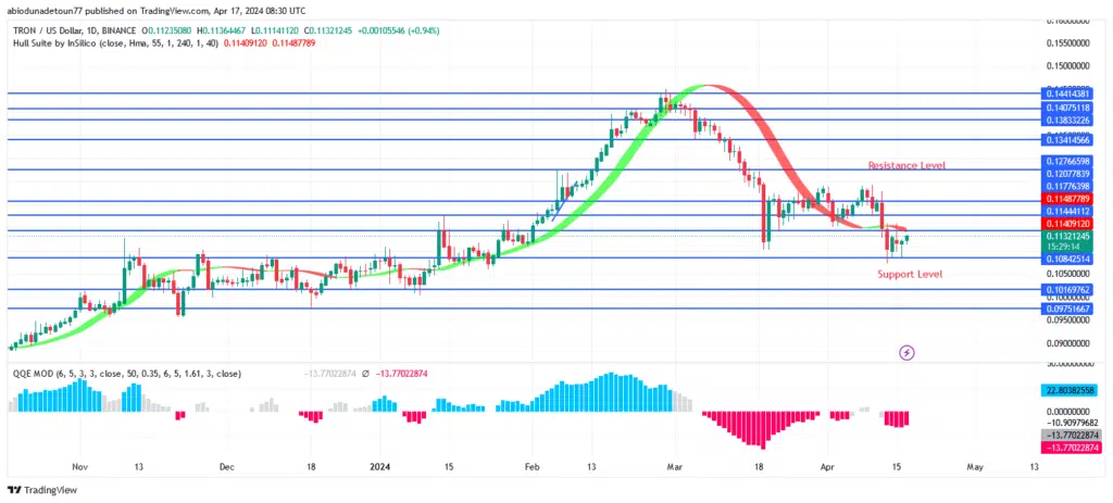The first four hours of the image demonstrate TRON’s tenacity. The fact that TRON is currently trading close to $0.114 has calmed the bears’ enthusiasm. It dropped steadily for more than a week before breaking through the $0.114 and $0.117 support levels. Buyers defend the level as the price breaks through the prior barrier and approaching the $0.114 resistance level. If the coin tries to break over $0.114, bulls may seek to move it higher.