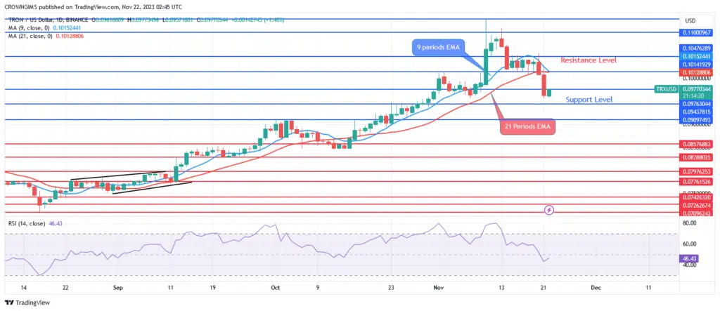 The price of TRON is presently below the exponential moving averages with 9 and 21 periods. The relative strength index’s period 14 signal line is pointing upward at level 32, suggesting a buy which may be a pullback.