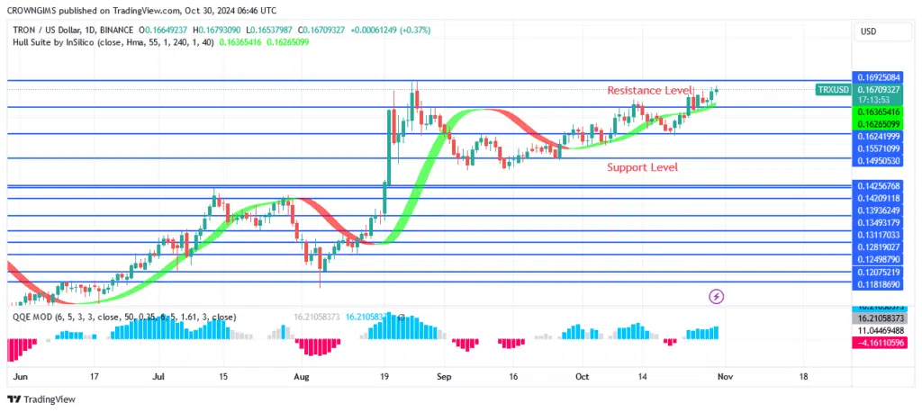 At the $0.169 resistance level, the bears gave up. The bulls take control when the price of TRON crosses over the Hull Suite forex signals indicator. The QQE MOD Crypto signaling indicator shows a positive trend because it is greater than zero. The price of TRON might be able to overcome the $0.180 and $0.185 barriers if the buying trend continues above $0.169. The price may approach the $0.155 and $0.150 levels if it remains below $0.162.