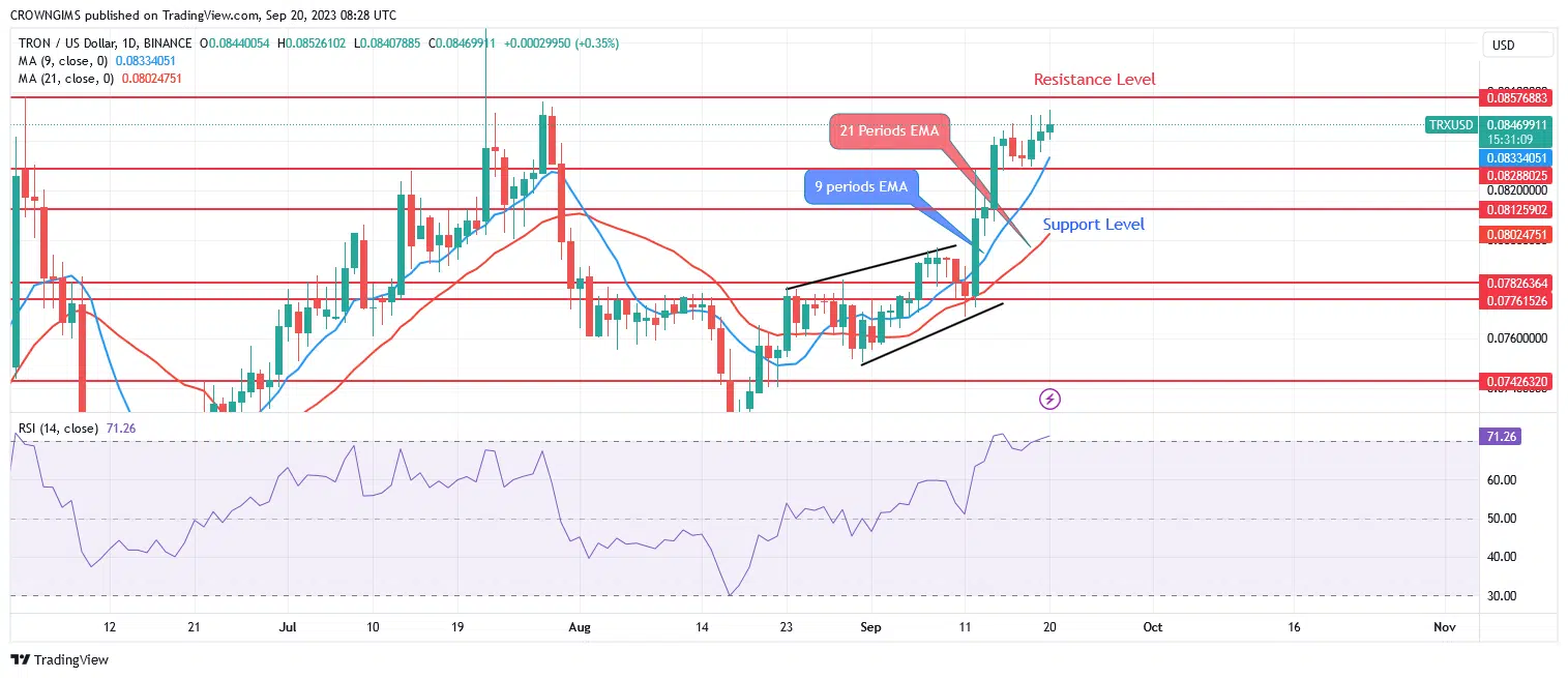 The price of TRON may increase to $0.090 and $0.094 levels when the buyers’ momentum breaks through the $0.085 resistance level. If the price of TRON drops below the $0.082 barrier level and sellers continue to be interested, the support levels of $0.081 and $0.078 may be breached.