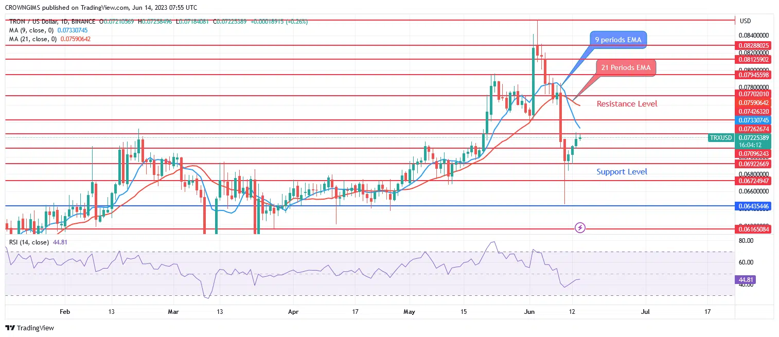 In case the price of Crypto advances past the $0.071 support level and sellers continue to be active, the $0.069 and $0.067 support levels can be approached. The price of Tron could increase to $0.074 and $0.077 levels if the buyers’ momentum breaks through the $0.072 resistance level.