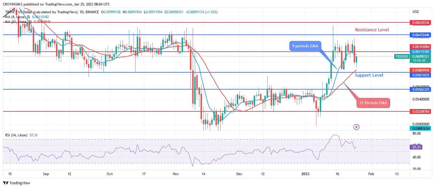 Tron is currently trading below the 9-period EMA and the 21-period EMA indicating bearish momentum. The signal line for period 14 of the Relative Strength Index is at 42 levels and is pointing upward indicating a buy signal which may be a pullback.