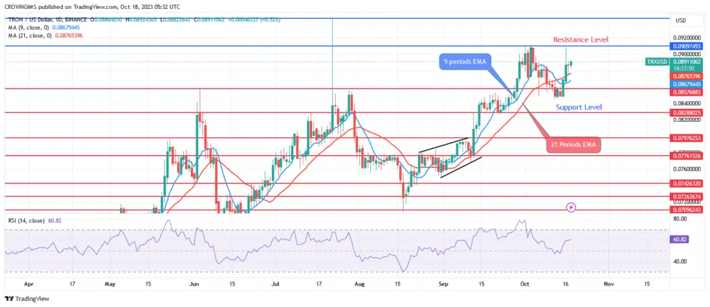 The price of TRON may increase to $0.094 and $0.097 levels if buyers’ momentum breaks through the $0.090 resistance level. If the price of TRON drops below the $0.085 barrier level and sellers continue to be interested, the support levels of $0.082 and $0.081 may be breached.