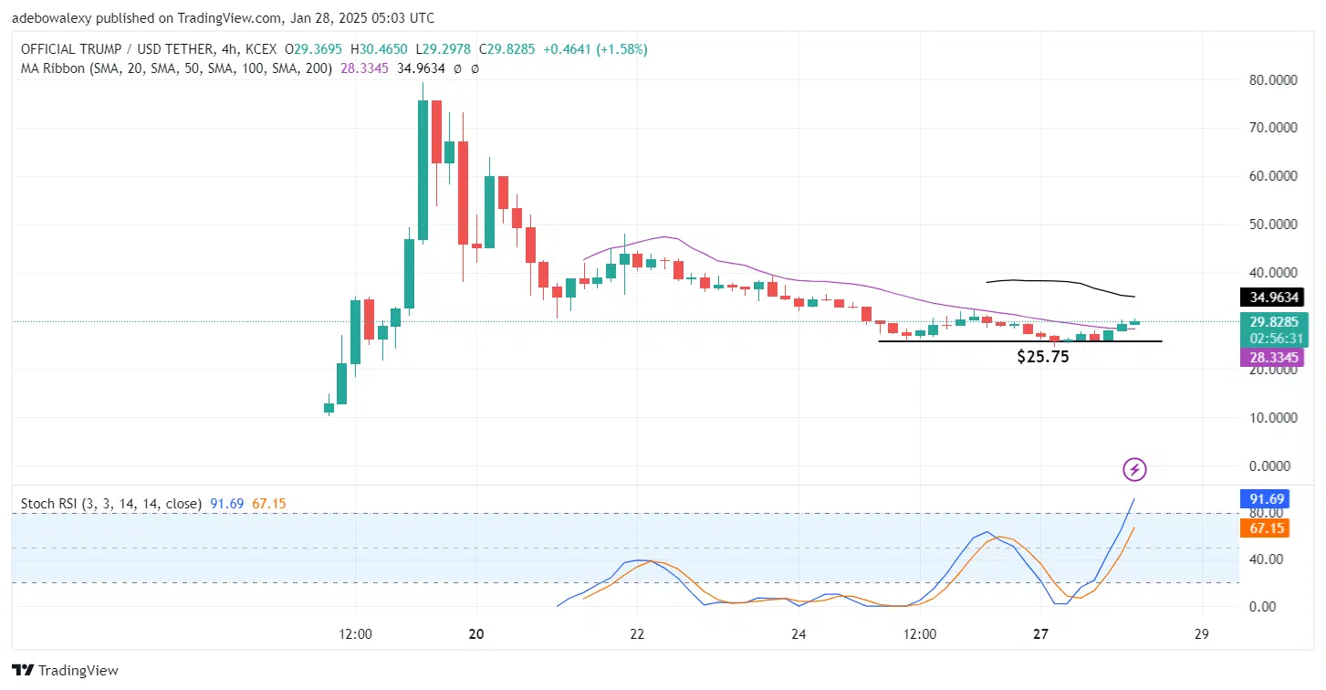 The TRUMP OFFICIAL market, a newly launched token, has managed to gain massive traction over the past few days. The magnitude of this traction can be seen in the earliest price candles on the chart. Nevertheless, the market has experienced reduced bullish activity, and price action now appears calmer. Currently, price activity is steadily rising from the $25.74 support level.