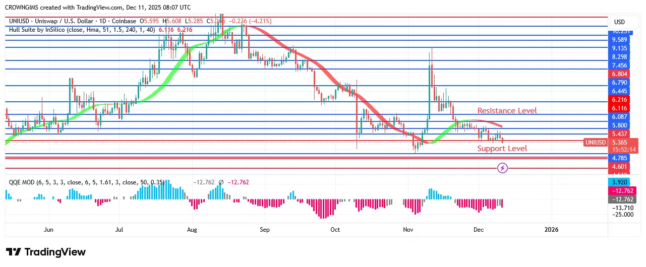 If retailers can go below the $4.8 counterargument, they can attempt to investigate the $4.0 and $3.5 prospects. If buying pressure increases at $5.4, it can surpass the $6.0 resistance level and reach the $7.4 potential. Uniswap is showing a generally negative trend as it is trading below the Hull Suite cryptocurrency signal indicator.
