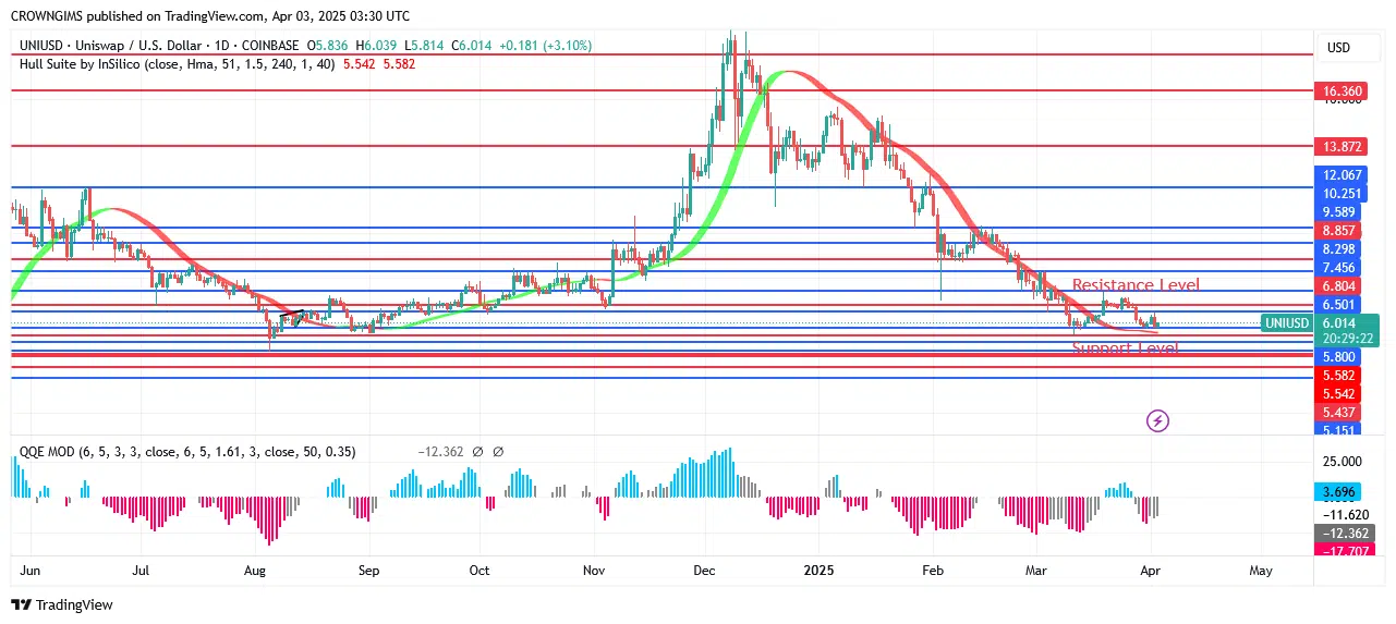 Uniswap’s trading below the Hull Suite cryptocurrency signal indication indicates a negative trend. It can overcome the $6.5 resistance level and rise to the $6.8 to $7.4 levels if buying pressure picks up around $5.8. If sellers are able to break through the $5.8 support level, they may try to reassess the $5.4 and $5.1 levels.