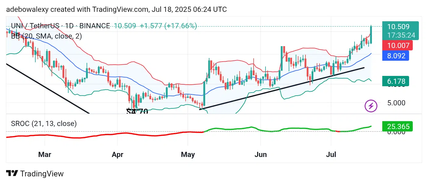 Even on shorter time frames, the Uniswap market shows continued bullish strength. The ongoing session reveals that price remains firmly above the $10 threshold—also above the upper band of the BB indicator.