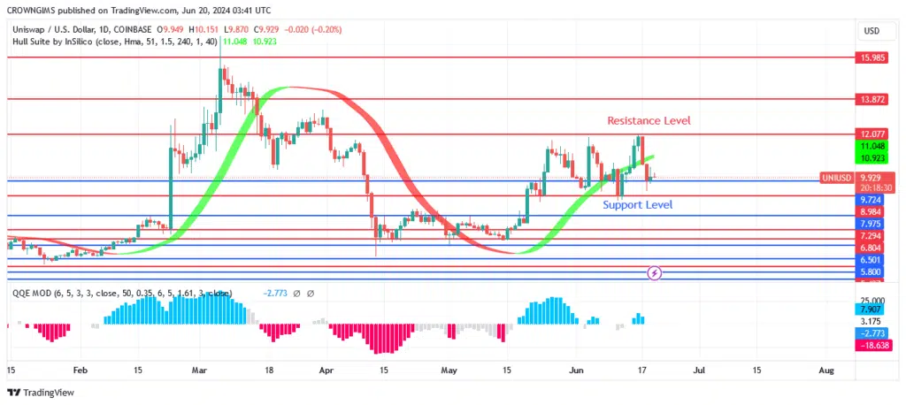 A good trend is indicated by Uniswap’s trading above the Hull Suite indicator for cryptocurrency signals. Should sell pressure build up below $9.7, the support levels at $9.0 and $7.9 might be completely demolished. A reexamination of the $13.8 and $15.9 levels may be necessary in response to buyers’ pressure above the resistance level of $12.0.