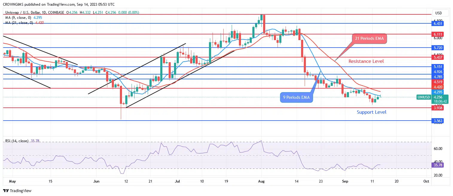 The $4.7 and $4.9 resistance levels may be broken if there is enough buying pressure to surpass the $4.5 resistance level. Uniswap levels of $3.5 and $3.1 will be put to the test if sellers can push the price below the $3.9 support level