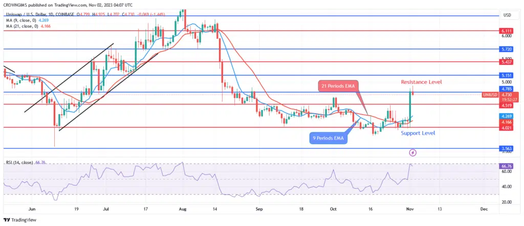 The daily chart of Uniswap exhibits a strong upward trend. Currently, Buyers are preventing the market from declining beyond $4.0 level. Last month, there was a bearish pressure on the cryptocurrency. The price found support at $4.0 level. The bearish enthusiasm faded as the $4.0 low was tested. On 01 November, a sizable bullish daily candle appeared, and the price began to incline. The slide completely shattered the previous resistance level of $4.5. The price is now aggressively increasing towards the $5.1 resistance level.