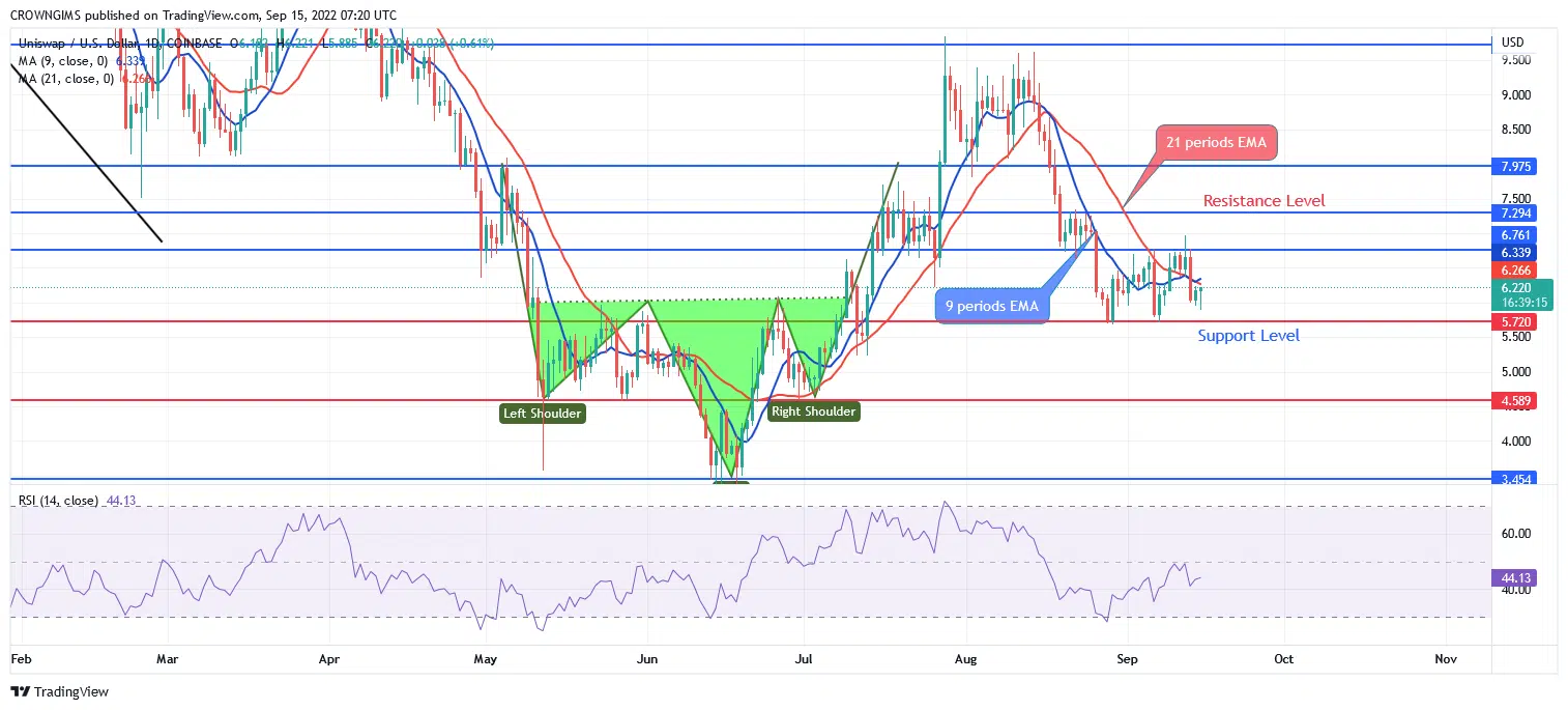 When the sellers break down $5.7 price level, it will push Uniswap price to $4.5 and $3.4 price levels. In case the bulls were able to exert pressure to break up the resistance level of $6.7, the price may increase to the resistance level at $7.2 and $7.9 levels