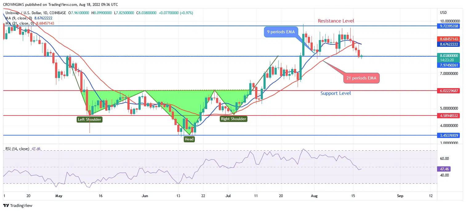 On the long-term outlook Uniswap is bearish. The coin found resistance at $9.7. On July 28, Sellers interrupts the price increase at the same level and the price started decreasing. Sellers are gathering momentum to push down price. The price is currently struggling to break down the support level of $8.1. More bearish candles are producing and the price may going down accordingly.
