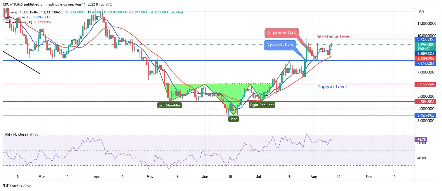 Uniswap is bullish on the long-term outlook. The bulls maintain their position in the Uniswap market. The formation of a bullish pattern called an inverted head and shoulder catalyse a bullish momentum. The bullish pressure pushed the coin to reach the resistance level of $9.7 on July 28. The price pulled back and retested $7.9 level. Since then, price has been ranging within $9.7 and $7.9 levels.