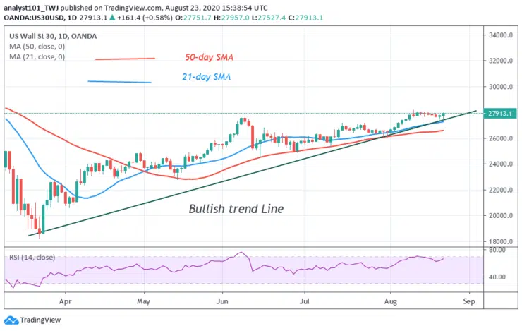 US Wall Street 30 is in an upward move. However, the uptrend has been interrupted as price consolidates below level 28000. Today, price is attempting to break the resistance level as the index moves up.