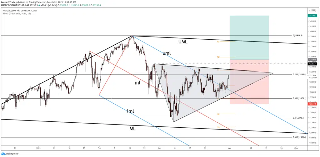 The aggressive breakout above the descending pitchfork’s upper median line (uml) and through the pivot point 12,931 followed by an upside breakout from the current chart pattern may bring a bullish opportunity.