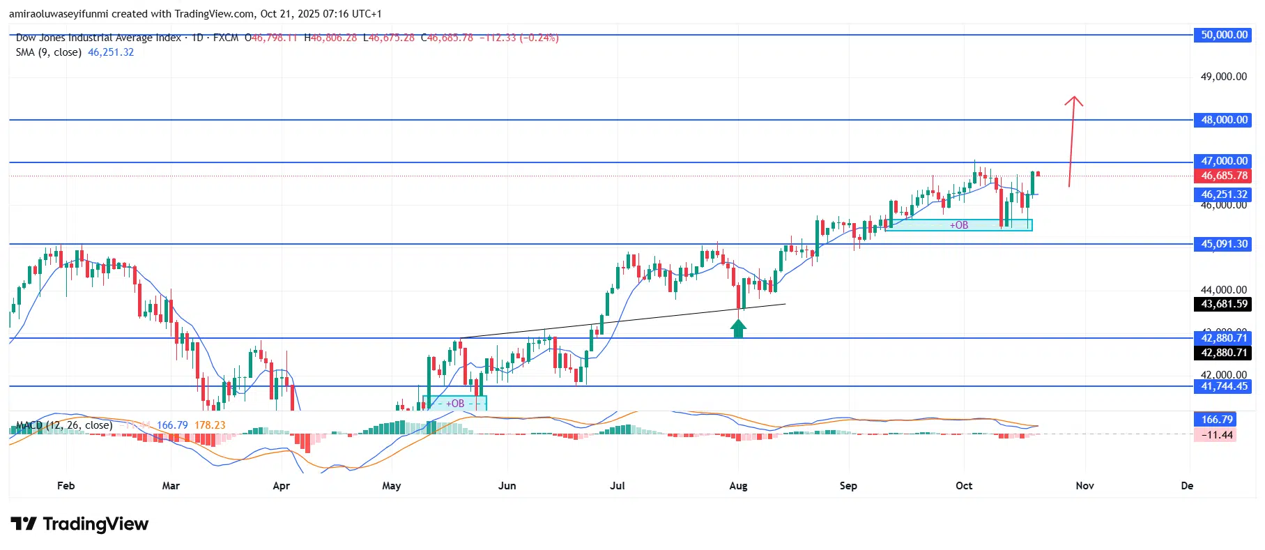 Looking ahead, US30 appears set to approach the $47,000 resistance zone, with a possible extension toward $48,000 if bullish strength persists. A confirmed daily close above $47,000 would further reinforce the ongoing uptrend, indicating potential momentum toward the $50,000 psychological level. As long as the index sustains structure above $46,000, the bullish outlook remains dominant, supported by favorable technical alignment and insights drawn from forex signals that validate continued institutional accumulation.