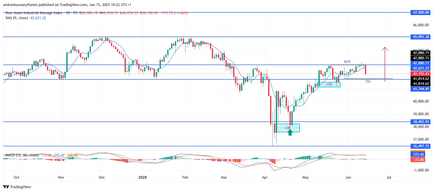 US30 is nearing a 4H demand zone between $41,740 and $41,810, an area that previously sparked bullish momentum. The recent dip below the 9-period SMA indicates short-term weakness.