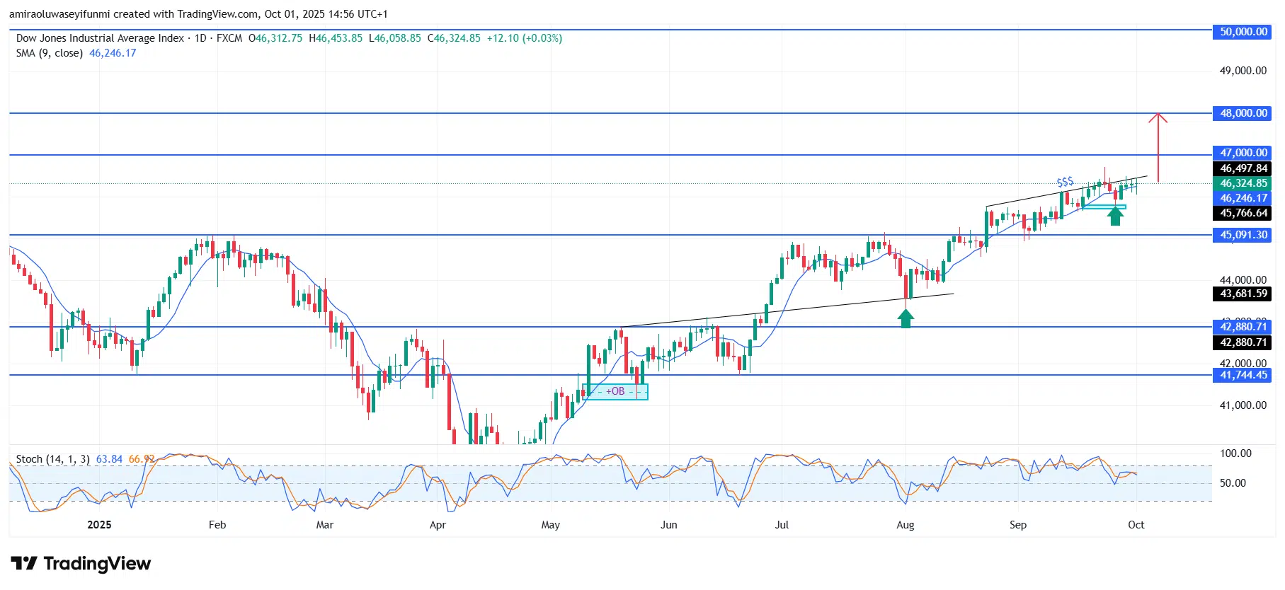 Looking ahead, US30 is positioned to extend its climb toward $47,000, with the possibility of reaching $48,000 if bullish momentum holds. Sustained support above $46,250 would further strengthen the bullish outlook, with pullbacks expected to stay limited. The technical setup suggests that well-timed entries around current price levels could capture additional upside potential, offering traders valuable forex signals for continued gains.