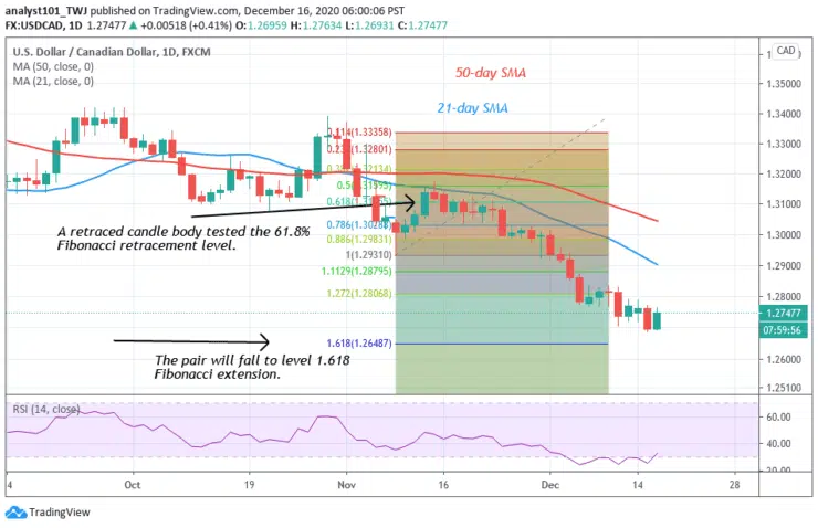 The USD/CAD has been in a downward move. From the price action, the pair’s downtrend is ongoing. According to the Fibonacci tool analysis, the market will reach level 1.618 Fibonacci extension or 1.2650. There could be a further downward move after this.