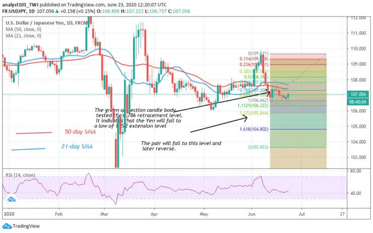 The Yen is currently on a downward move. The Yen is making a retest at level 107.222. The downtrend will resume. The green correction candle body tested the 0.786 retracement level. It indicates that the Yen will fall to a low of 1.272 extension level. After reaching the target price, the market will reverse. However, the reverse will not be immediate.