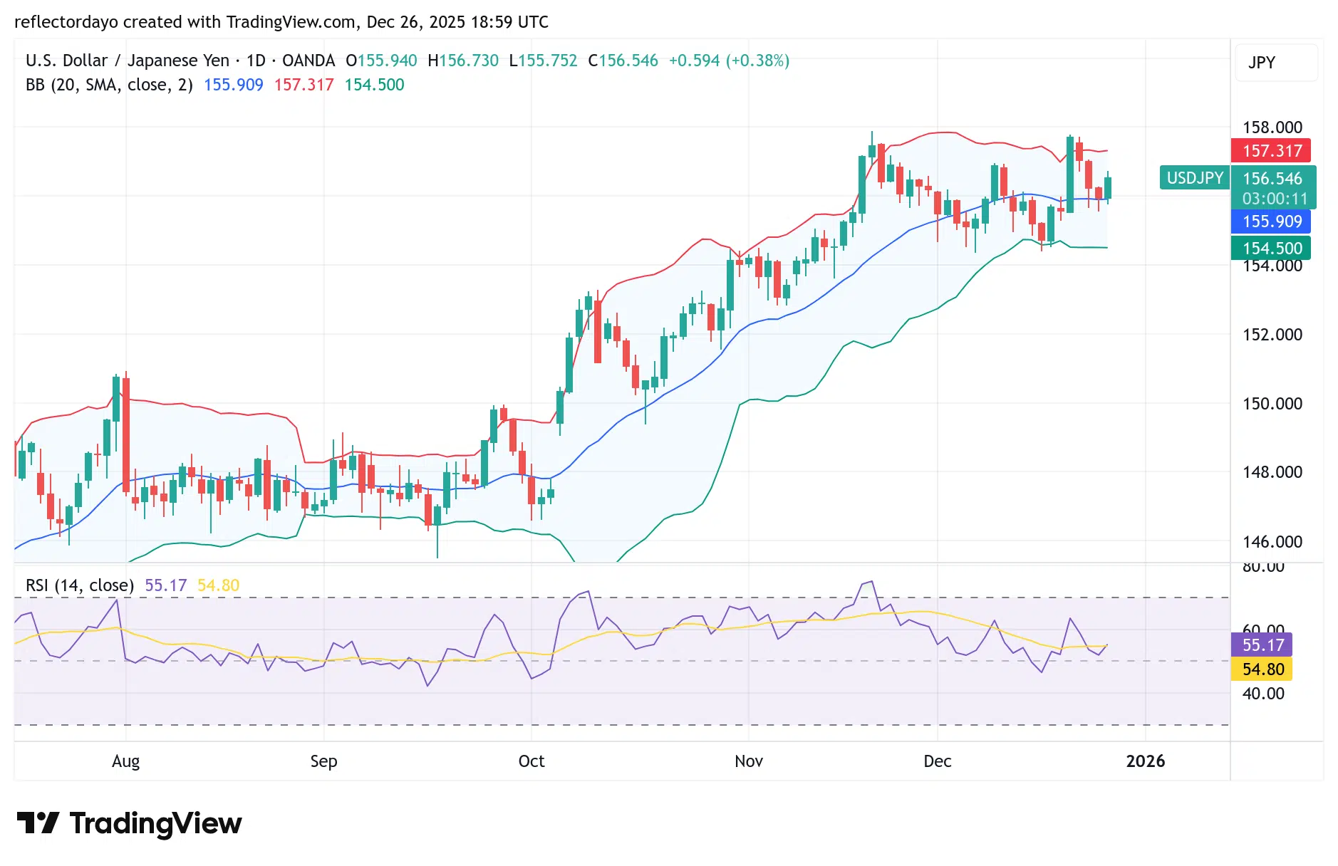 Recently, the price attempted to break above the 158 level but failed to do so. On December 19, the market opened around the 155 level and surged strongly toward 158; however, price action was rejected at this point, triggering a pullback back toward the 155 level. The repeated rejection around 158 reflects a long-term bullish trend encountering a strong psychological and technical resistance zone. This resistance has been further reinforced by intervention risks and seasonally low liquidity, resulting in the current phase of price consolidation.