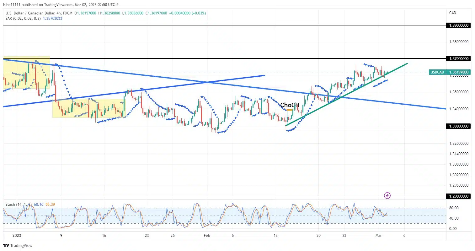 A double bottom formed at 1.3300 in February when the market was oversold. The market’s ascent has broken the bearish trendline. The market is currently aiming for a supply level of 1.3700.