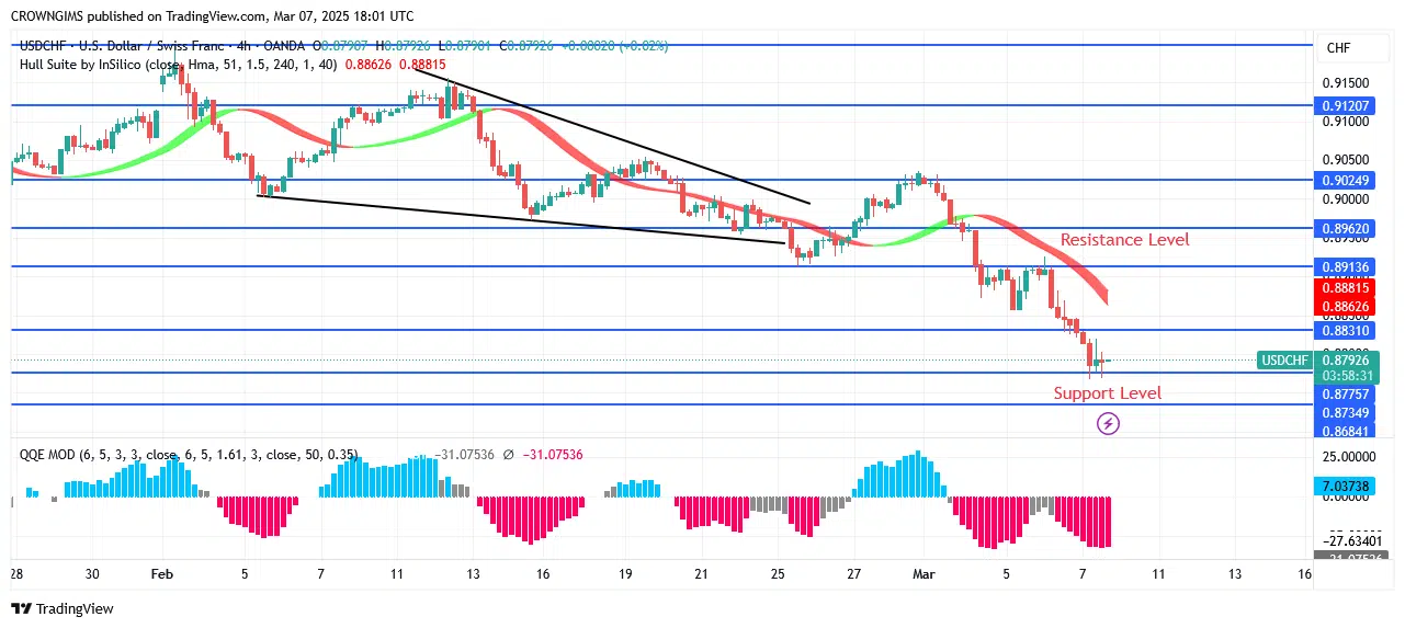 The USDCHF chart has been trending downward over the past week. Clients have profited from the strong USDCHF market since the price first appeared at $0.88 three weeks ago. As of February 25, the USDCHF market was dominated by sellers. The two currencies were worth $0.89 a few days ago. A bearish engulfing candle pattern was observed at the initial level that was suggested. The price thereafter began to fall by almost $0.87. At the previously noted resistance level, the bearish harami candle pattern was observed to develop. At the moment, $0.86 is the target price.