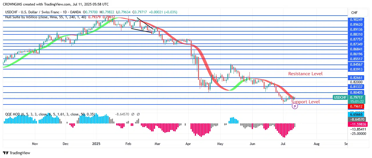 A negative trend impetus is indicated by the USDCHF exchange rate’s present position below the Hull Suite. The forex signal QQE MOD, which is located below the zero line, indicates price falls. The price may rise above $0.81 and get closer to the $0.82 hedging scenario if the buying impulse can hold above the $0.80 resistance position. If merchandisers put forth enough effort to lower the price from $0.79 to $0.77, they can still lower it to $0.75.