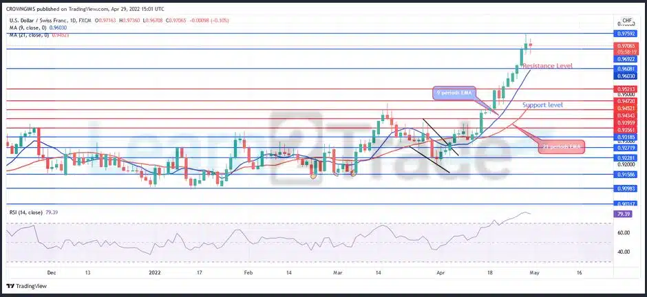 The 9 periods EMA has crossed the 21 periods EMA upside. USDCHF is trading above the two EMAs at a distance. The Relative Strength Index period 14 is at 79 levels bending down to indicate bearish market direction. When the resistance level of $0.97 holds, bullish momentum may decrease, USDCHF price may bounce off the level, then, 0.96 levels may be reached and it may decline to $0.95 level. Should the bulls break up the resistance level of $0.97, the price may increase towards $0.98, and $0.99 levels.