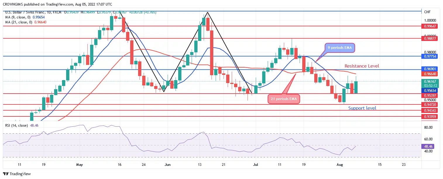 USDCHF is currently trading between the two EMAs and the 9 periods EMA remains below the 21 periods EMA. The Relative Strength Index period 14 is at 48 levels bending up to indicate bullish market direction. Should the bulls break up the resistance level of $0.96, the price may increase towards $0.97, and $1.00 levels. When the support level of $0.95 holds, bearish momentum may increase, USDCHF price may bounce off $0.96 level, then, 0.95 levels may be reached and it may decline to $0.94 and $0.93 levels.