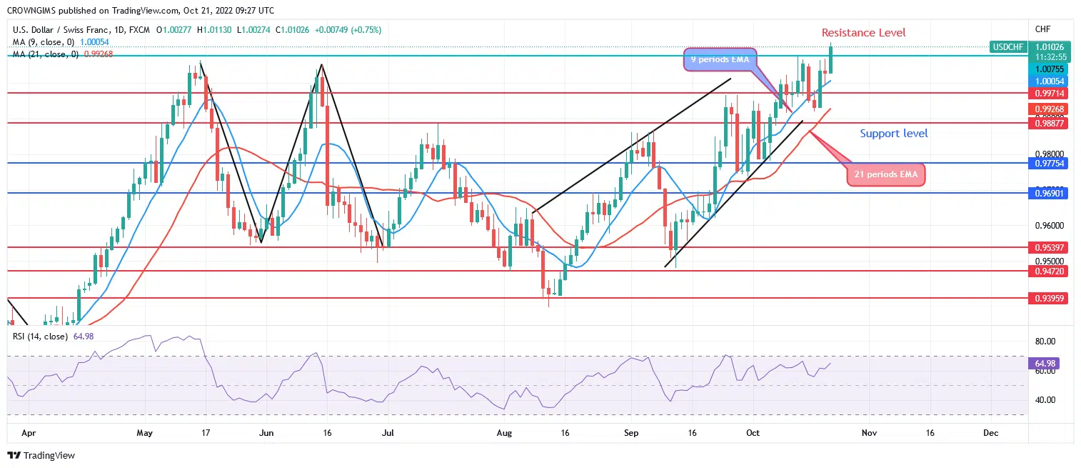 USDCHF is trading above the 9 periods EMA and 21 periods EMA at distance indicating strong bullish momentum. The Relative Strength Index period 14 is at 65 levels bending up which connote buy signal. As buyers are gaining more momentum, the resistance level of $1.01 may be tested and broken upside, above it are $1.02 and $1.03 resistance levels. In case sellers oppose the bullish movement at $1.01, price may go down towards the support levels at $1.00, $0.99 and $0.98.
