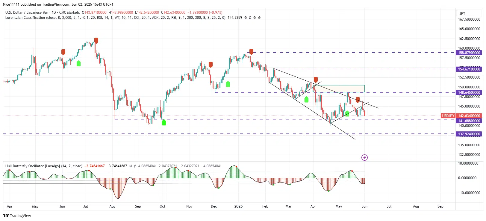 The price is now approaching the support level at 141.670. The Hull Butterfly oscillator confirms bearish momentum on both the daily and 4-hour charts, while the Machine Learning Lorentzian Classification Indicator aligns with the downtrend. The price appears poised to challenge the liquidity-rich zone marked by relatively equal lows near the 141.670 demand level.