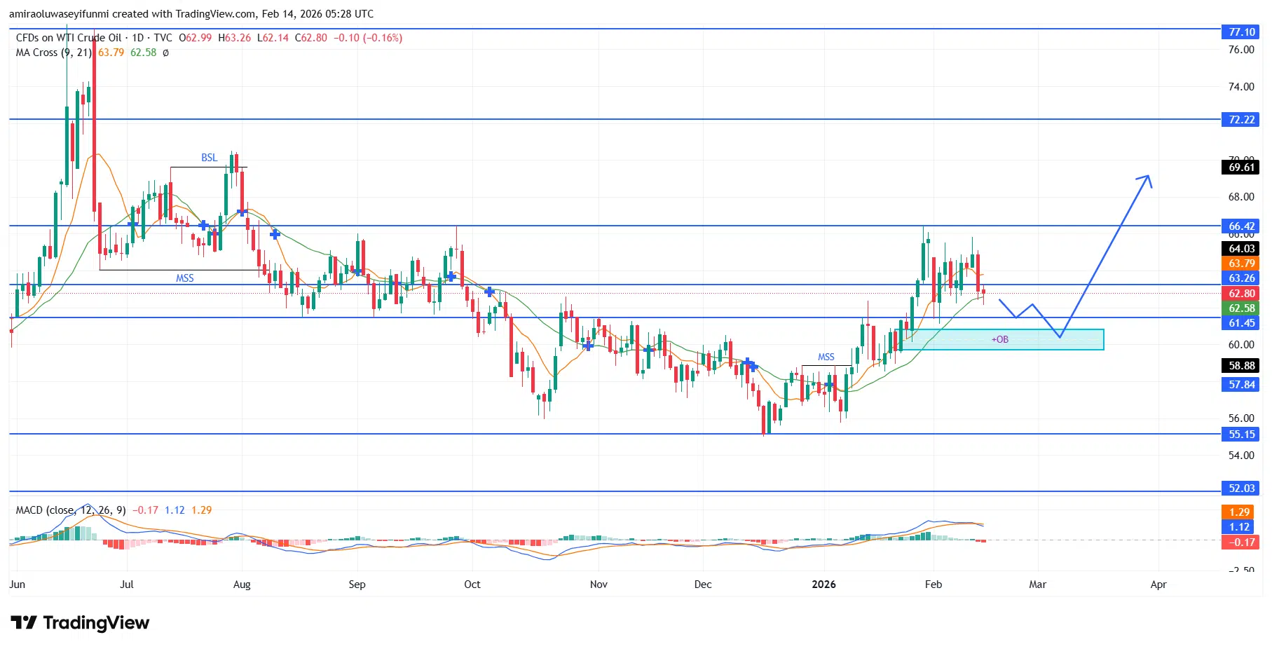USOil bullish structure indicates growing strength and upward potential. The overall technical landscape demonstrates a steady rebuilding phase after an extended bearish period, with key momentum metrics increasingly favoring buyers. The moving average alignment confirms that the faster average remains positioned above the slower average, validating upward directional pressure, while price stability above the $62.580 equilibrium zone reinforces constructive positioning. At the same time, the MACD histogram continues to print slightly positive readings despite minor contraction, signaling that upward momentum remains intact and pointing toward underlying accumulation activity.