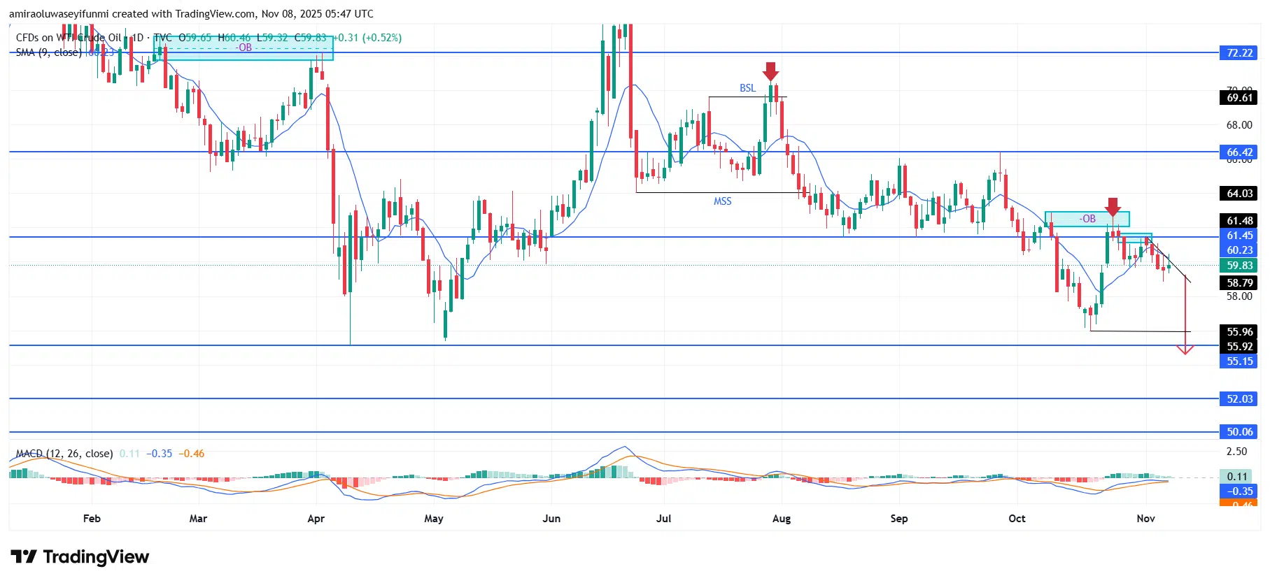 From a structural standpoint, the market’s recent rejection from the $61.450 supply zone reaffirms renewed downside pressure following a brief retest of the order block. The formation of consecutive lower highs and lower lows underscores the prevailing bearish structure, indicating sustained selling influence across the medium-term outlook. Additionally, the market’s inability to hold above the short-term moving average strengthens expectations of further depreciation. Price movement now aligns with the broader downtrend, as traders monitor liquidity accumulation below the current trading range for potential continuation setups.