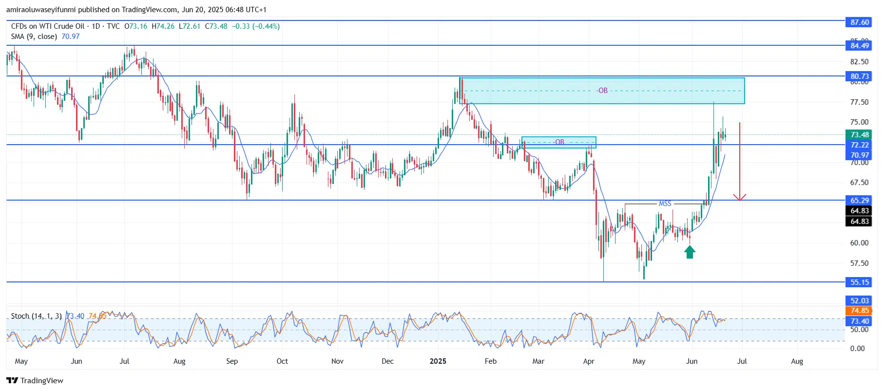 The Stochastic Oscillator is crossing downward near its mid-level, indicating increasing bearish momentum. If the price sustains a break below $72.20, it may pave the way for a move toward the next key support at $65.30.