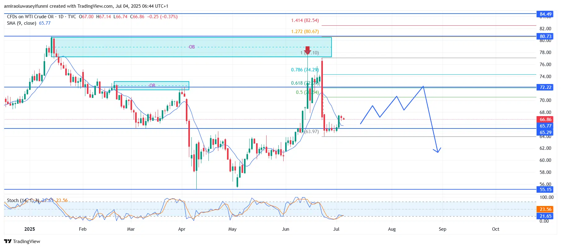 USOil currently exhibits short-term bullish momentum after filling the previous liquidity void, with price consolidating just above this zone. The 9-period SMA is now positioned below the price action, confirming short-term upward pressure.