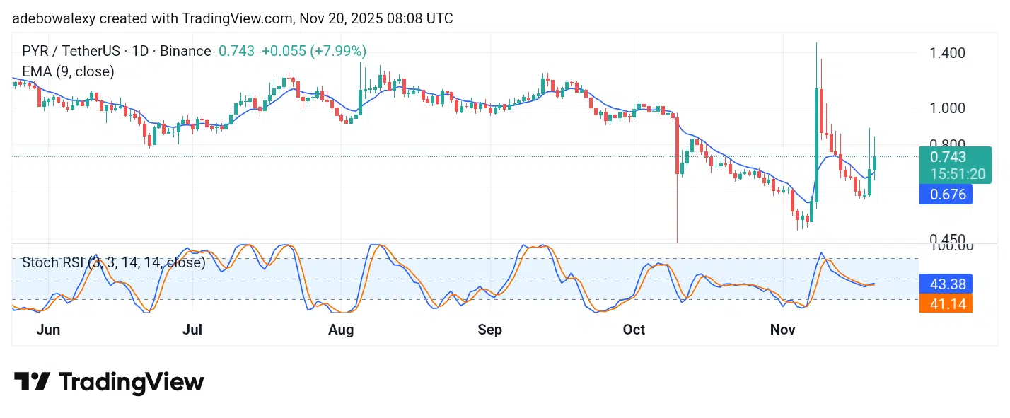 For the past two sessions, PYR price action has been edging toward higher ground. The last price candle on the chart is a green one but has surely seen a downward contraction of its initial size.