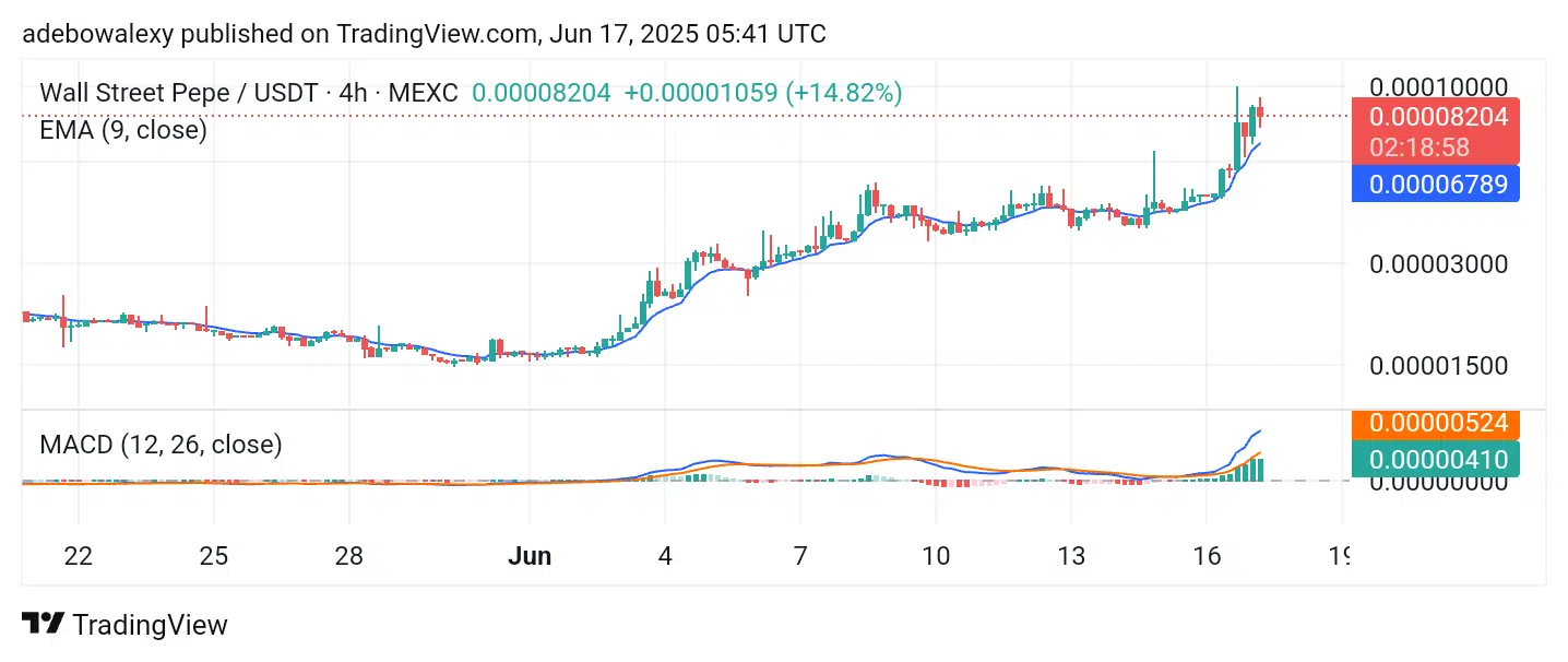 On the hourly chart, the Wall Street Pepe market has landed precisely on the $0.00008200 price level, as indicated by the most recent price candle. However, the appearance of this candle suggests that buying forces are already acting to keep the market above this level. Furthermore, price action stands above the 9-day EMA, which is a positive technical signal.