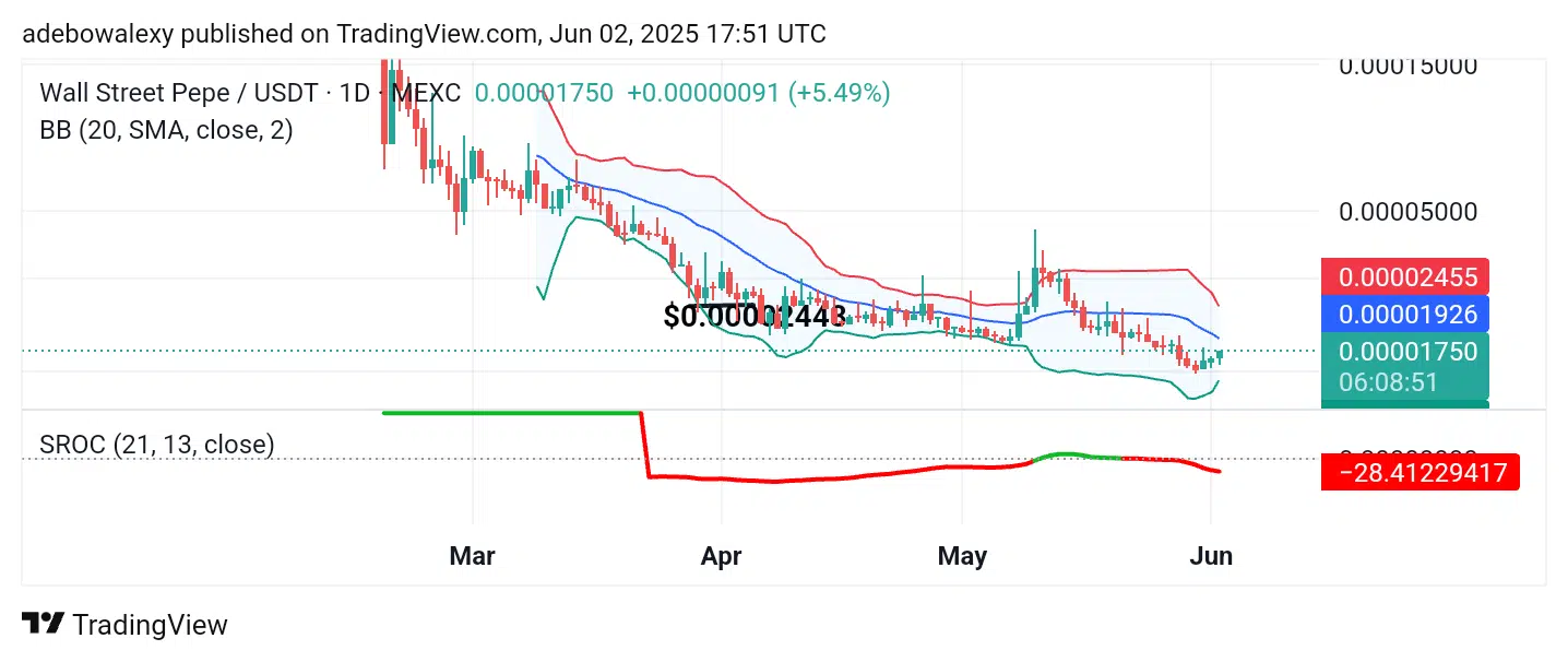 On the 1-hour chart, Wall Street Pepe’s price activity continues to push toward higher levels. The previous session showed a more significant price move, while the ongoing session has sustained the same bullish path. Consequently, price action remains near the upper limit of the Bollinger Bands.