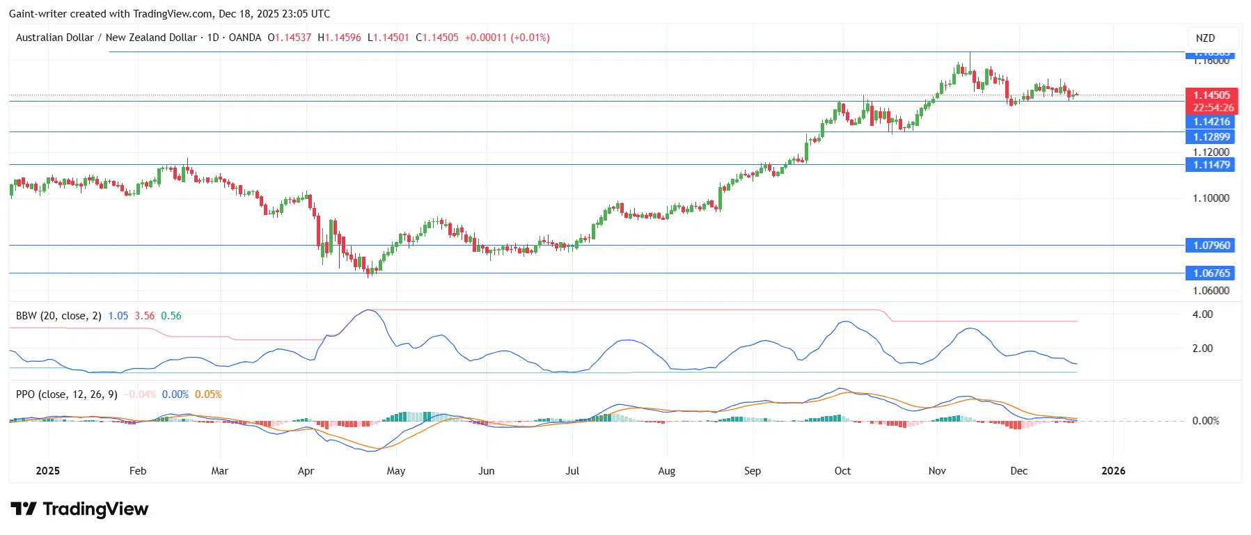 AUDNZD’s strong advance through much of 2025 has stalled just below the key 1.1600 level. The pair is now trading around 1.1450, where upside momentum appears to have dissipated.
