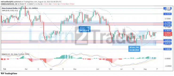 On the 4-hour chart, the market is tapering down into a symmetrical triangle chart pattern. As price moves closer to the tip of the triangle, there is going to be a breakout, which is most likely to the downward side. Sellers will make use of this pattern to test the 0.69510 weekly support again. The MACD shows undulating reducing bars to show the tapering nature of the market.