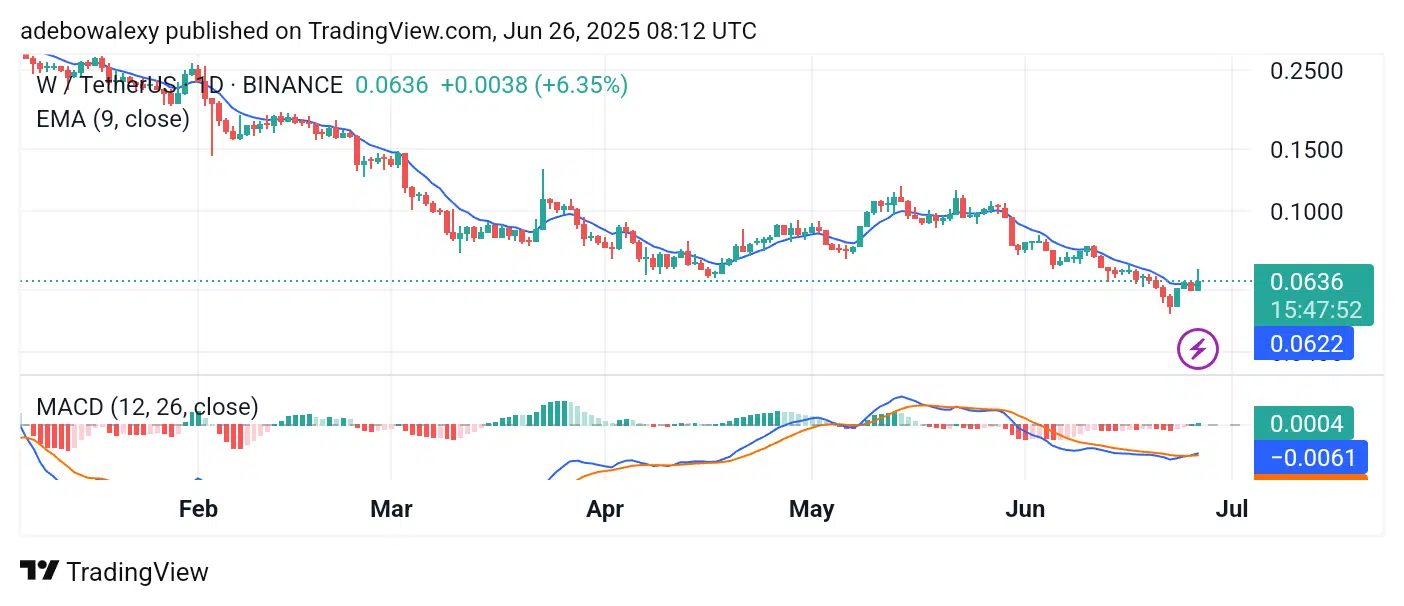 While the Wormhole token has gained 6.26% as of the time of writing, it can also be observed that price action has experienced a pullback during the ongoing session. The last price candle on the chart poked through the resistance formed by the 9-day Exponential Moving Average (EMA) line.