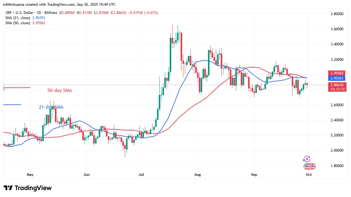 On the 4-hour chart, XRP has been declining since September 13. The cryptocurrency price is experiencing a pattern of lower highs and higher lows. On the downside, the altcoin has stabilized above the $2.70 level. It is trading above the $2.70 support level and below the moving average lines, which represent $3.00 resistance. XRP is falling toward its current support of $2.70.