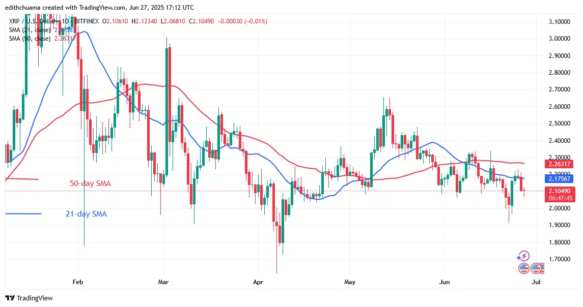 XRP’s price remains below the moving average lines as it continues its range-bound move above $2.00.The altcoin has been trading above the $2.00 support but below the moving average lines. On June 22, the bears pulled back after breaking past the $2.00 support. XRP began to decline once more after the bullish trend hit the 21-day SMA level.