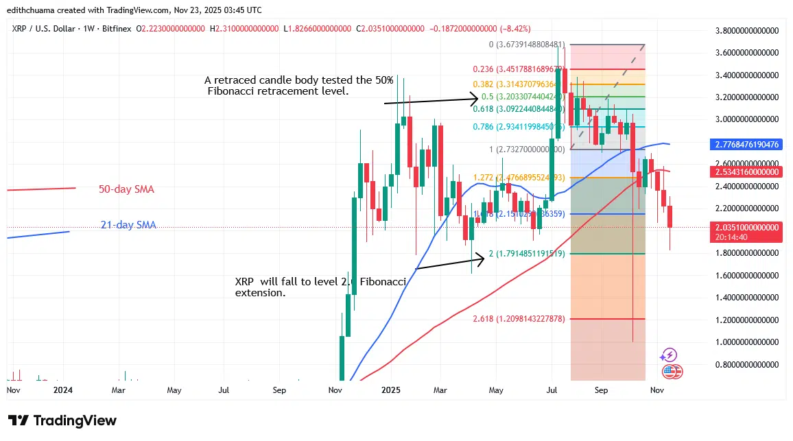 The XRP price has stabilized above a low of $1.80 as it corrects higher. Currently, XRP is range-bound, above the $1.80 support but below the $2.20 high. Currently, the price movement is trapped between the moving average lines. The price of XRP has remained steady, oscillating above the $2.00 support. However, the crypto signal is moving downwards below the $2.20 barrier.